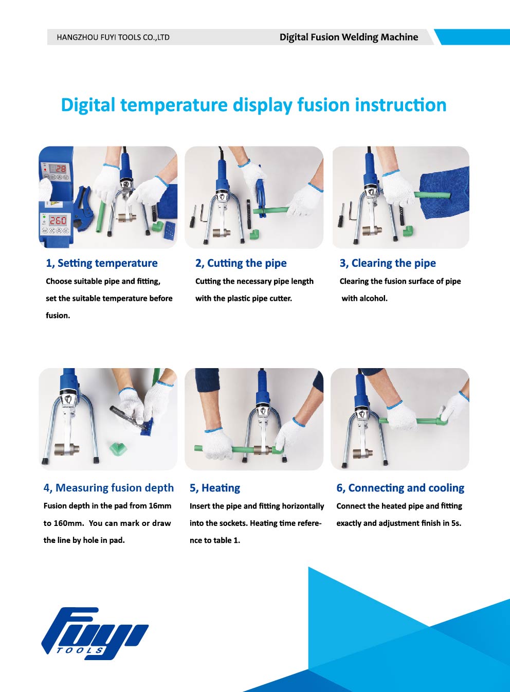 Jak používat digitální fúzní svařovací stroj 1. Nastavení teploty Vyberte vhodné potrubí a tvarovky, nastavte vhodnou teplotu 2. Řezání trubky Řezání potřebné délky trubky pomocí řezačky plastových trubek. 3. Čištění trubky Čištění tavného povrchu trubky alkoholem 4. Měření fúzní hloubky Hloubka fúze v podložce od 16 mm do 160 mm. Čáru můžete označit nebo nakreslit dírou v podložce. 5. Topení Vložte trubku a armaturu vodorovně do hrdel. Doba ohřevu odkaz na návod v sadě. 6. Připojení a chlazení Připojte vyhřívanou trubku a tvarovku přesně a upravte povrch v 5s.